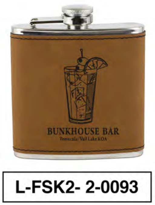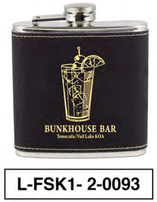 DESCRIPTION:  TEMECULA KOA - BUNKHOUSE BAR LEATHERETTE FLASK 6 PER CASE (ONE COLOUR) - 8.50$ PER UNIT